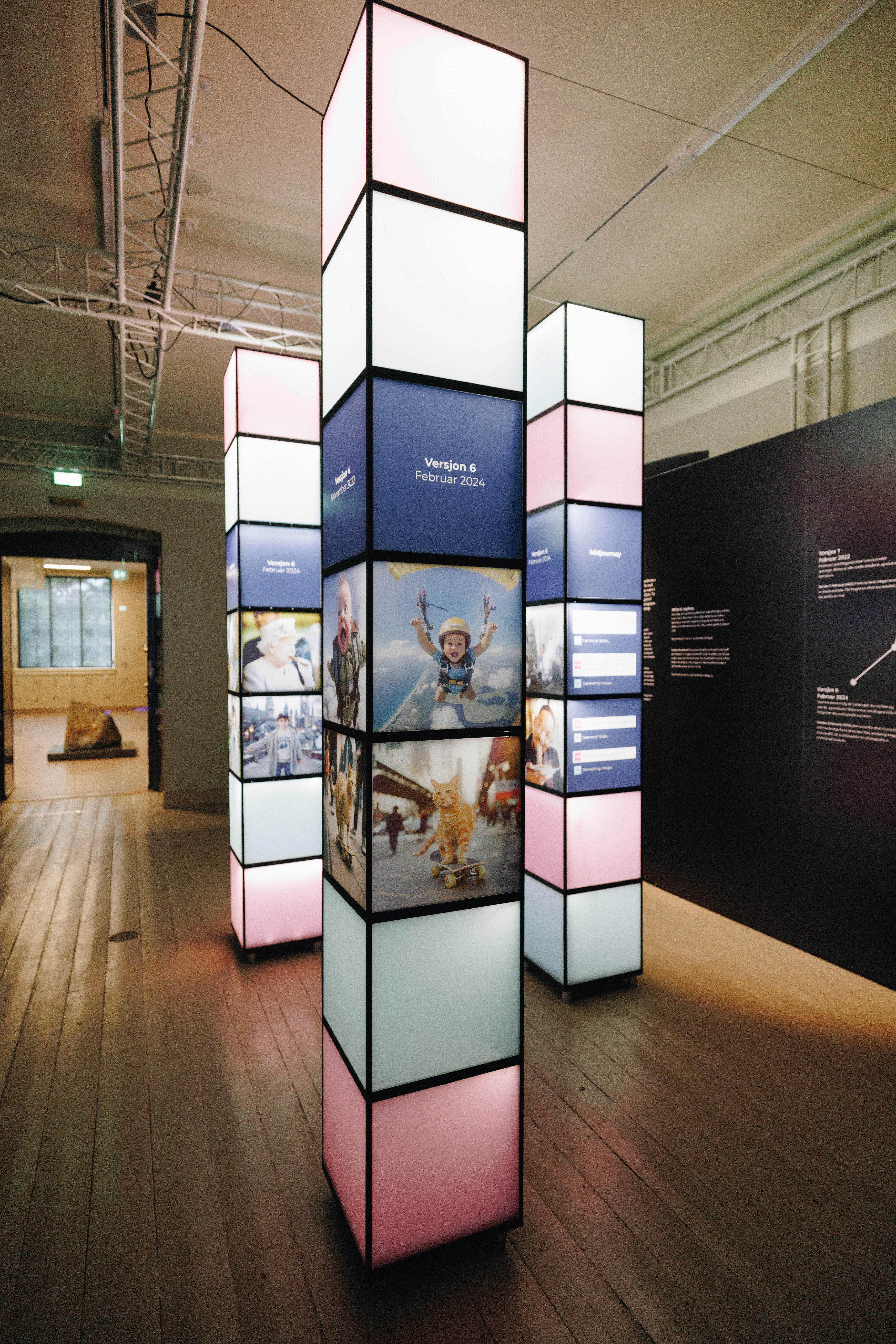 Pillar Forest: A physical timeline visualising the evolution of AI-generated imagery through versions of Midjourney, reinforcing the learning aspect.